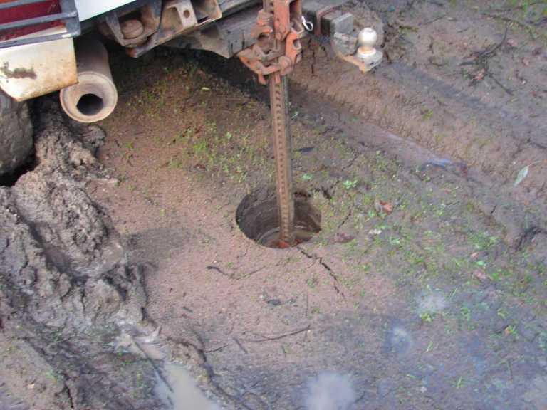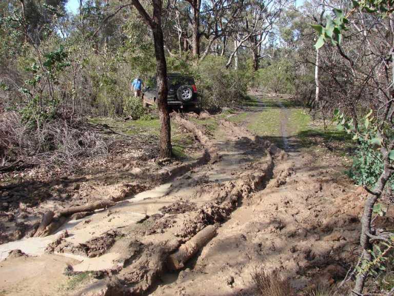 There were no ruts at all before I drove there,got the trailer stuck got out and went home for recovery gear,backed in as far as I dared,all was OK then plonk I went thru.The wet area comes up around a blind bend,no chance of stopping and turning around before you hit it,especially with a tandem trailer in tow.
