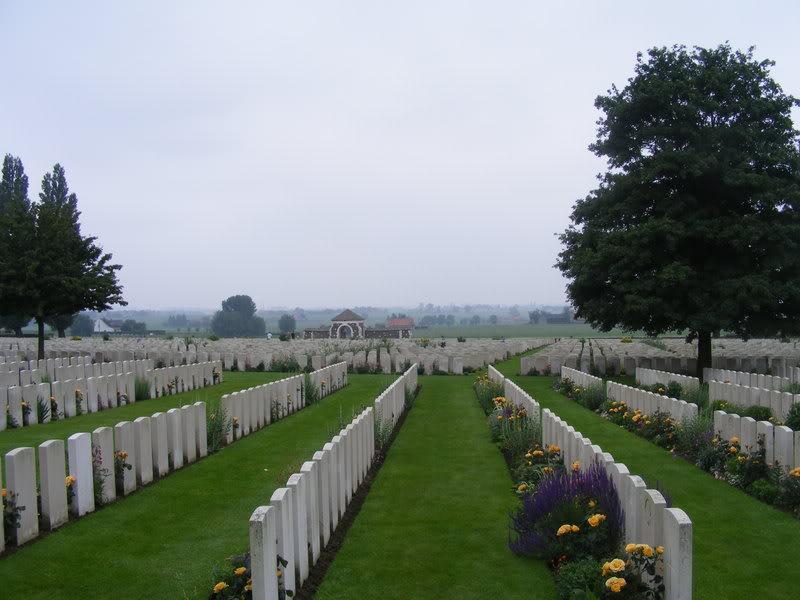 Right moving on to Tyne Cemertry. This is the biggest one with the war graves comishion WGC. The WGC has over 21,000 sites the world over. The first pic looks back over the head stones over what was the battle field of Paschendale. This was the 'hill' they were taking. The areal photos of the time show the area looking like the surface of the moon. There are 12,000 graves.