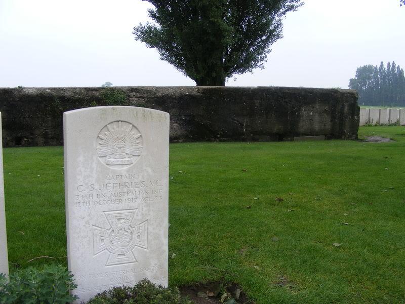 This head stone is of Capt Jeffries VC. Behind the stone is the pillbox he captured! He survived then went on to take a second and was killed.