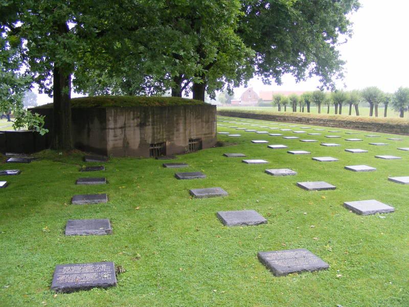 This is one of 2 german cemeterys. There are over 42,000 men in here. Each stone has the remains of 4 -16 men under them. In the middle of the yard is a mass grave half the size of a tenis court thats has 25,000 men in it. And two brits. The concret box is one of three pill boxes. That were part of hundreds that made the line.