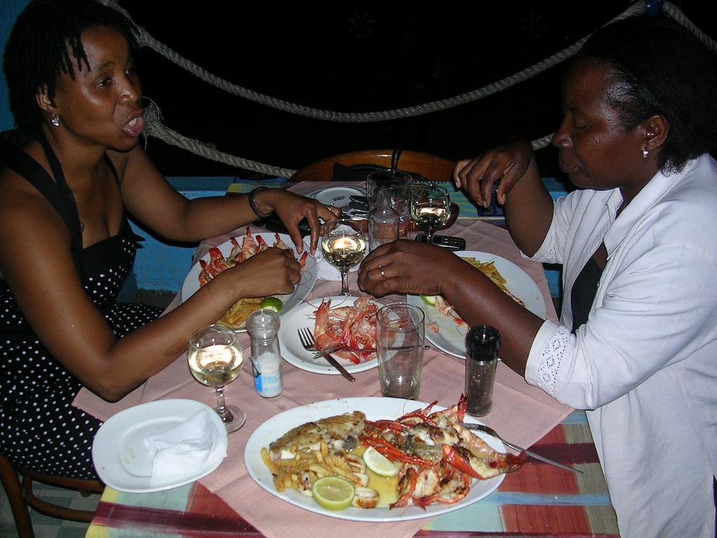 I said that they take their dancing seriously and then, they take their food seriously and, I love their prices. I sat at the table and was doing calculations of the menu prices on my mobile phone…the seafood here in Mozambique is excellent, this is a pretty average fare prawns, crabs, fish, for $5.20/plate…beer…..$1.25AUD..I get to eat a lot in Mozambique!!