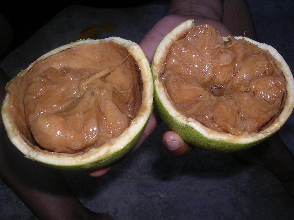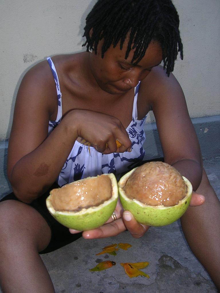 The inside is made up of the brown fruit mass which is around a number of seeds. It is only the mass that is eaten off the seeds, the seeds are almost plastic like in texture and, the taste of the fruit mass….well…the closest thing I can put it down to is….caramel. Not pretty to look at but a beautiful taste.