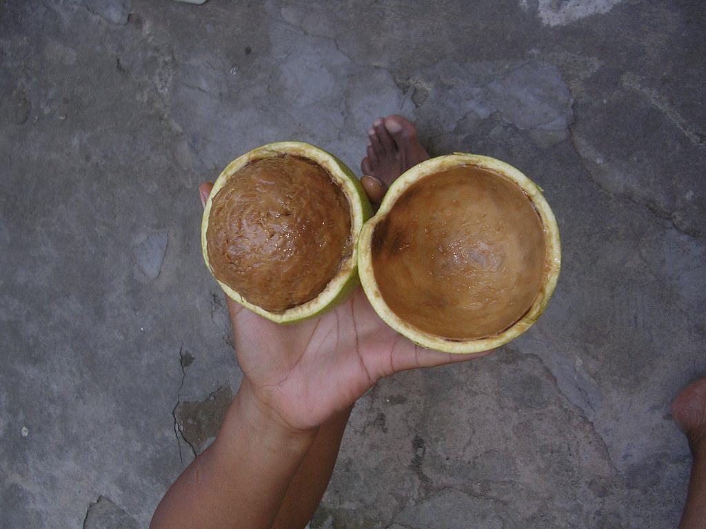 It grows bigger than the one I am holding. The outer case is amazingly hard and you have to fracture it to open and expose the fruit mass inside: