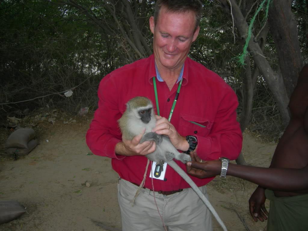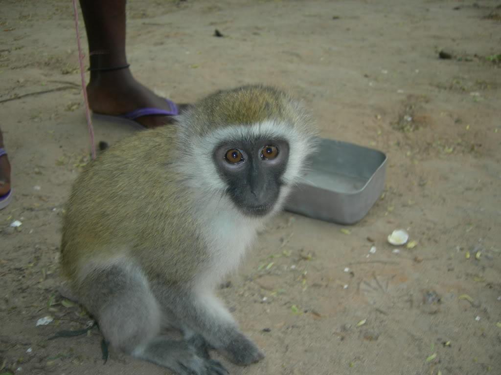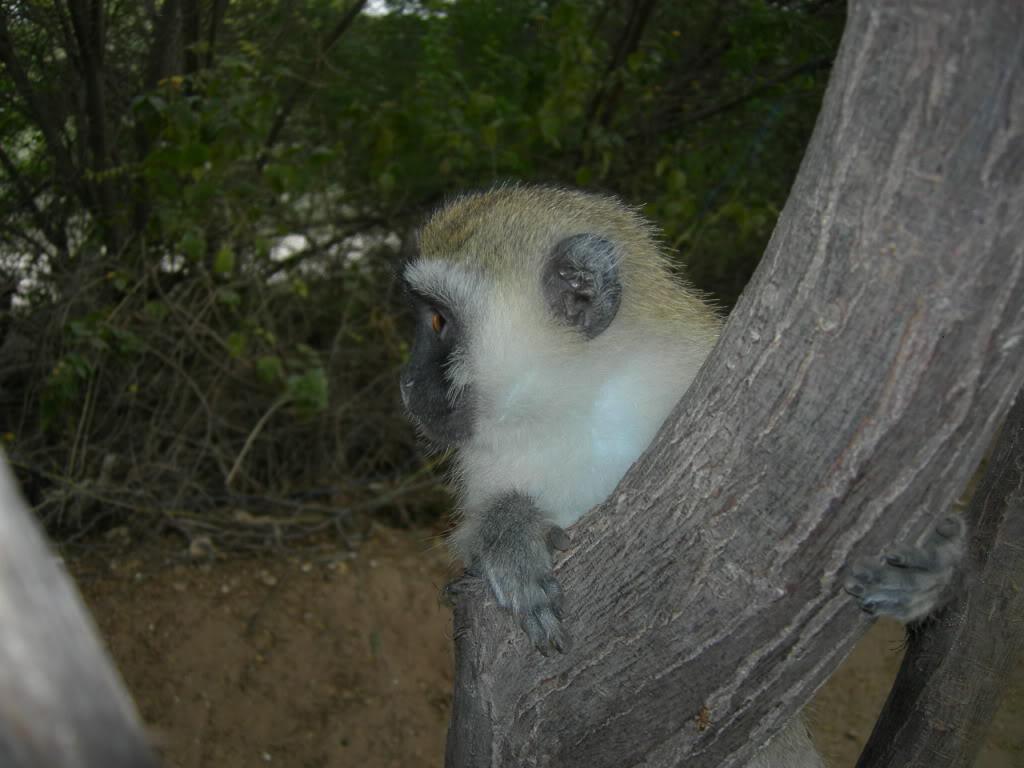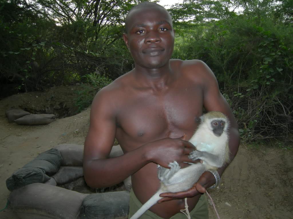 He is a Vervet monkey. They are quite common around the place, living in the thorn bush and the locals will try to sell them to you.