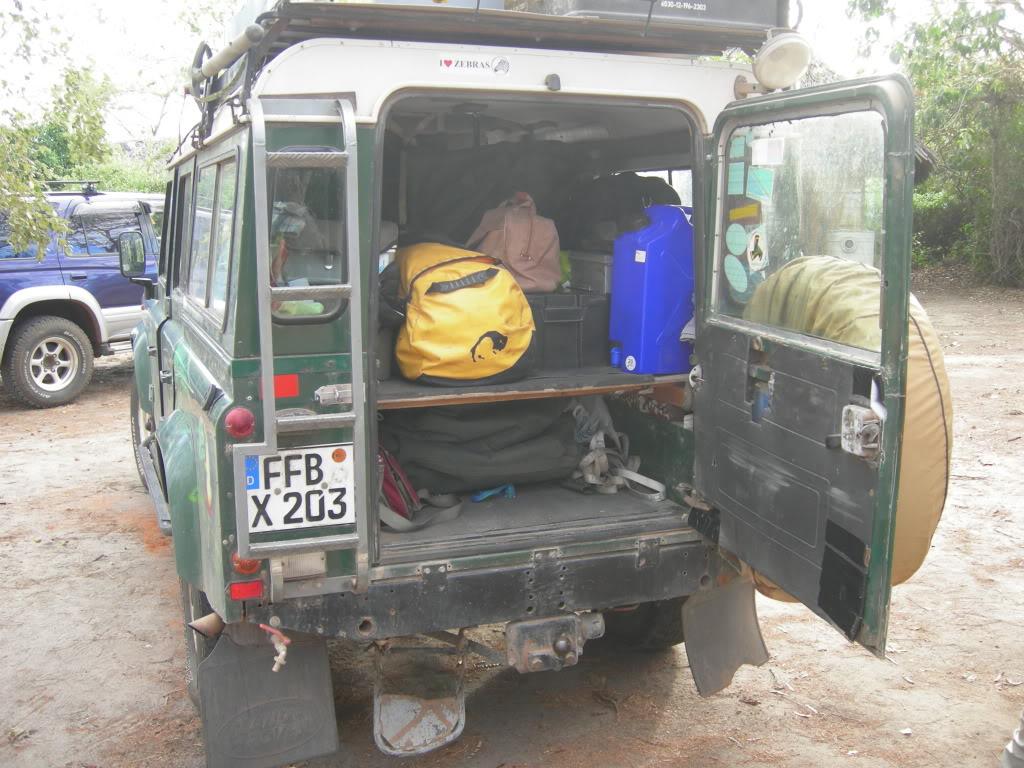 Then, I went down to a Bush Lodge for a beer and found this, it belonged to some really tragic Landy owners, who owned this, and another, and come from……….Germany. They have been driving around (as you can see from the rear door stickers) Africa for some years. Didn’t ask what they do in Germany, but they spend winter in both halves of the world and import/export their Landy to do it. This is from 1992 and was bought from Scotland. Lovely to meet and talk with them: