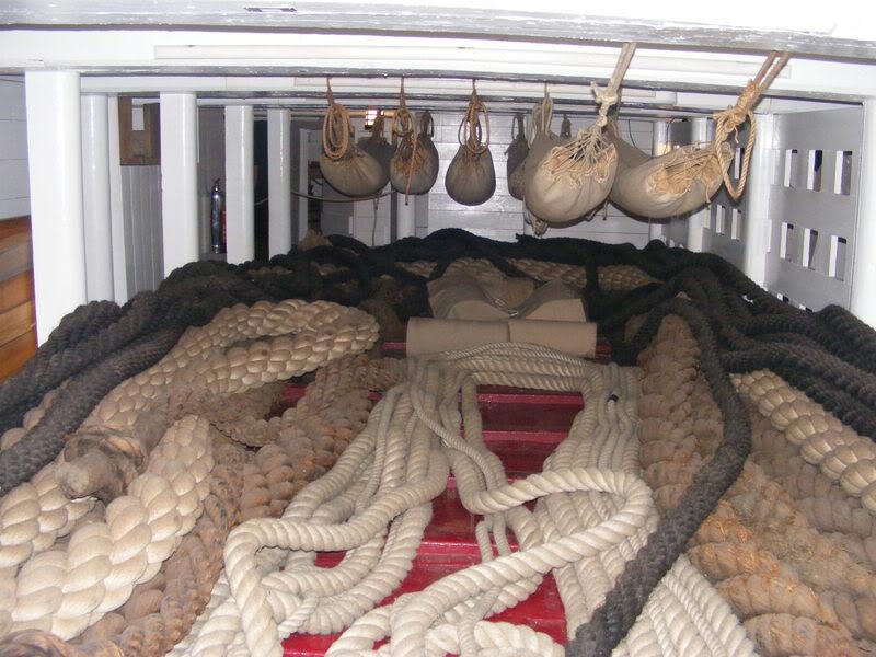 The anchor rope or hawser is 16 inches in diameter and it took 160 men on the capstan winch to raise the anchor. The capstan goes through two decks to accomodate all the men needed to operate it.