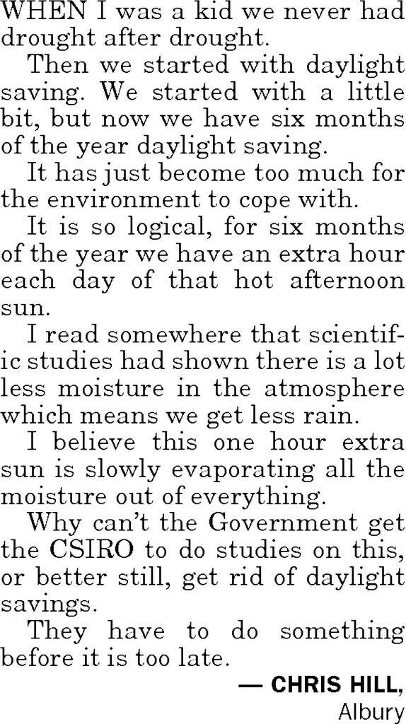 Better still, instead of using up all our daylight saving in summer, perhaps we could keep it and use it in winter when it's cold and dark!