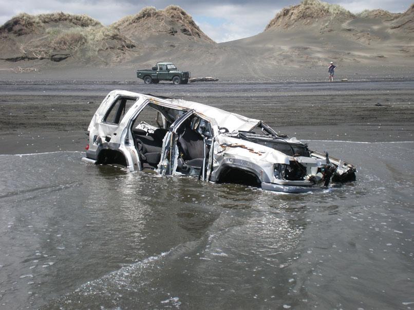 Someone went for a swim on Muriwai Beach. The destruction is completed by a bully so the vehicle is easier to collect at a later date. There's always a few.