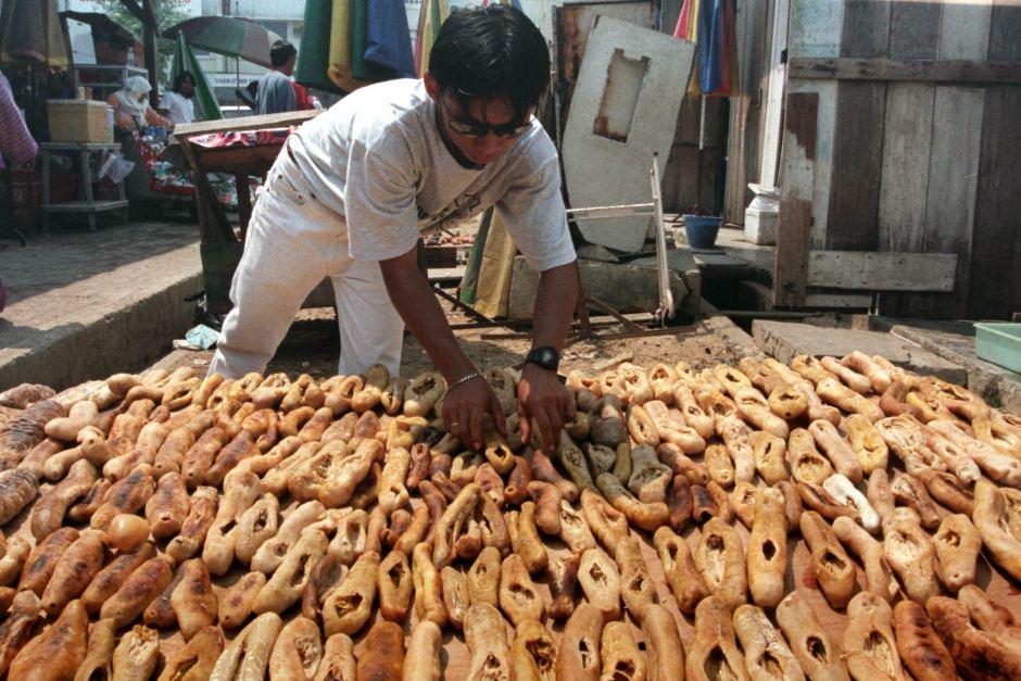 A vendor lays out sea cucumbers to dry at a market in Malaysia, where the sea creatures are a delicacy.