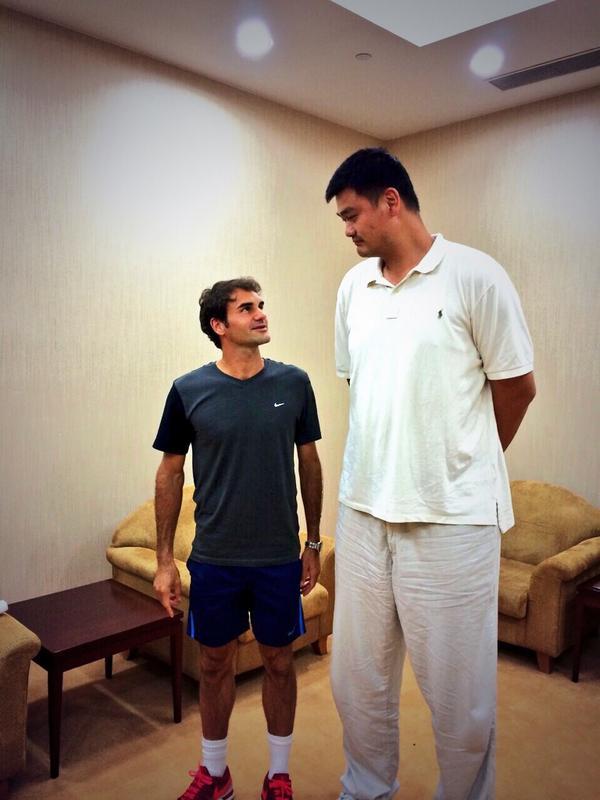 Roger Federer at 1.85m (6ft 1in) standing next to China’s former NBA star Yao Ming at 2.29m (7ft 6in)