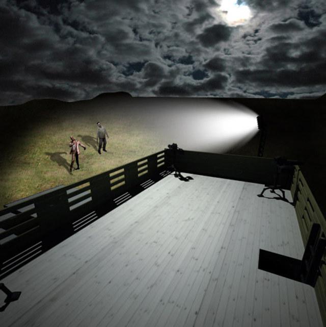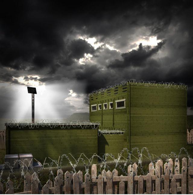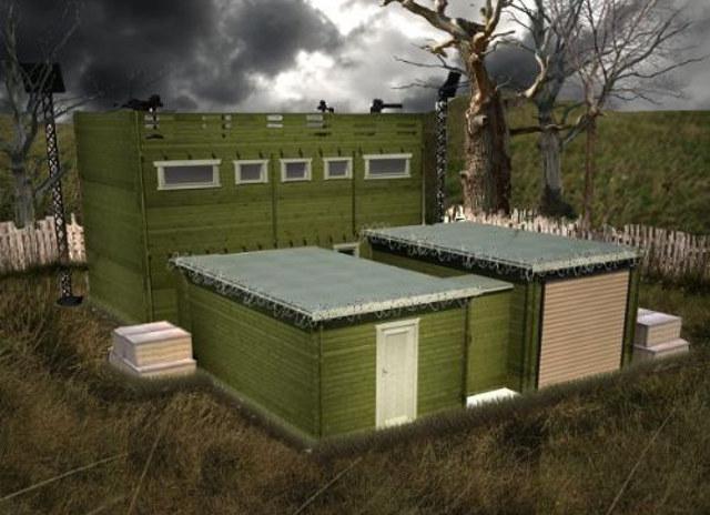 The ZFC-1 comprises of three sections, all of which are independent from each other with two lockable doors securing each building. This means for a zombie to breach the main large section they would have to somehow breach three very securely locked doors - which even your most advance lock picker would struggle to compromise. One of the smaller buildings is a garage with secure roller shutter doors - still large enough to secure a military vehicle or getaway car. The other building comes with a built in storage unit for food to help you last the duration of the apocalypse. There is also a great place to store any other weapons you require to keep the undead at bay. The third larger building at the back has two floors (containing a bedroom, a kitchen, a living room and even a gym) as well as an upper deck to give you a 360 degree vantage point with smart slots in the decking wall to allow you to shoot at intruders in the surrounding area. In the middle of the three buildings protected by walls around the outside and a mesh roof is a small garden to allow you some outdoor time and to plant and grow vegetables.