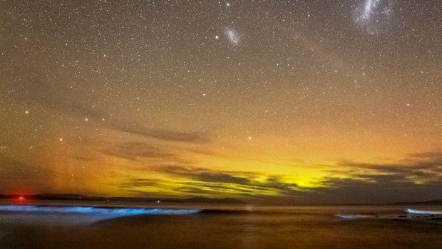 But mother nature has put on a rare double, with a light show taking place in the water complemented by the Aurora Australis which has splashed light and colour across Hobart's skies.