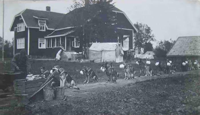 Border patrol service dogs waiting in line to get dinner. Finland, circa 1940