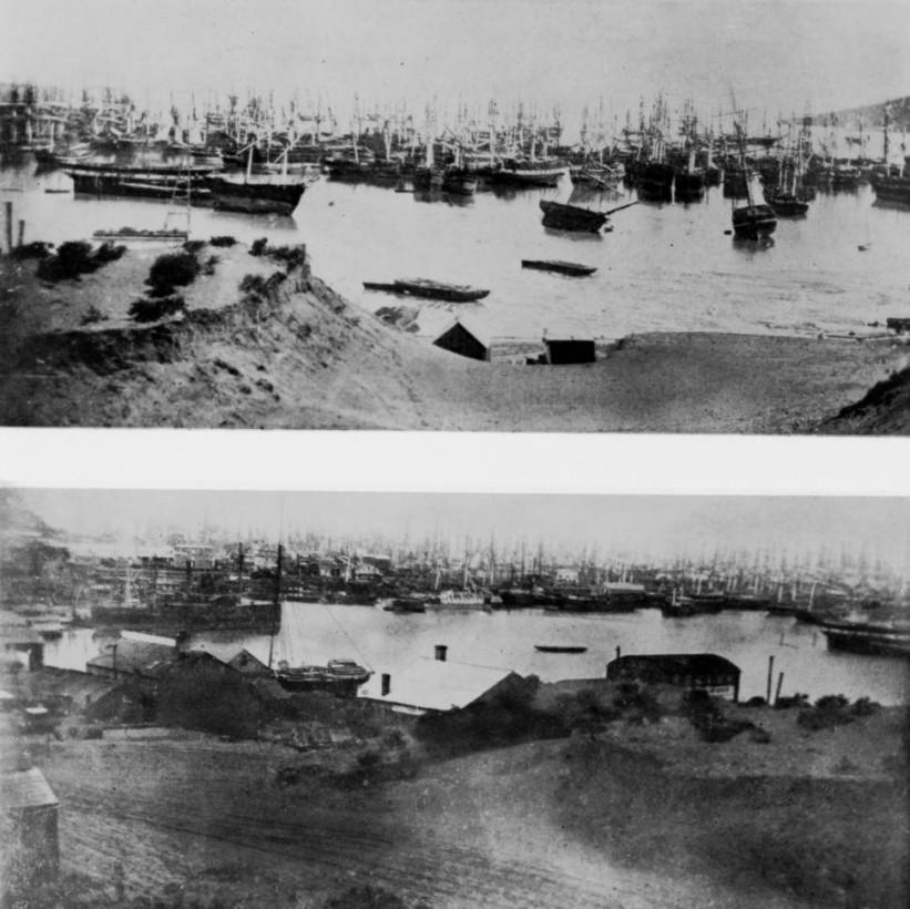 Abandoned boats in the bay of San Francisco during the gold rush in California in the 1850s.