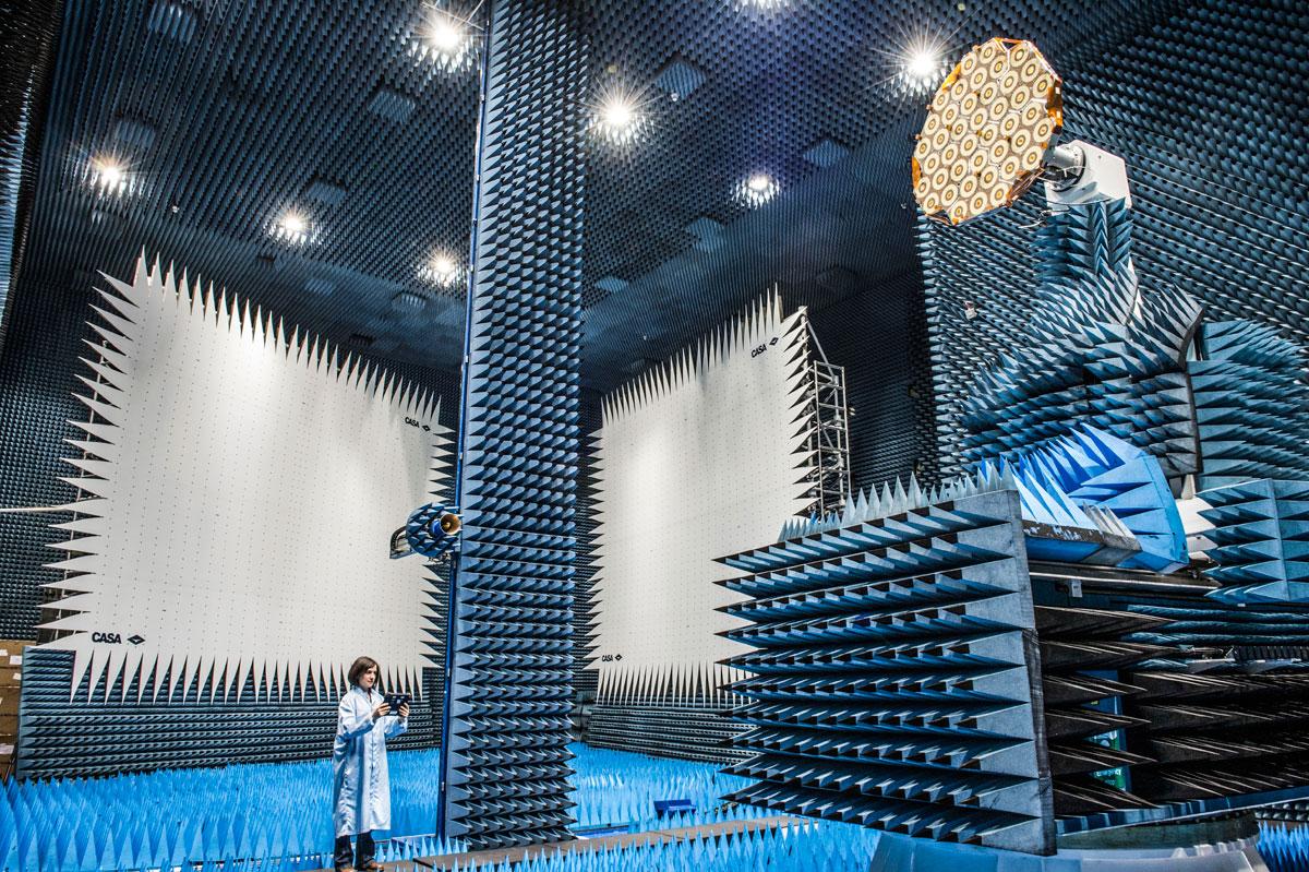 In this zone of silence, satellite antennas are tested ahead of launch. Metal walls form a ‘Faraday cage’ to block all external signals, isolating the facility from TV and radio broadcasts, aircraft and ship radars, and even mobile calls. Spiky foam cladding absorbs radio signals internally to create conditions simulating the infinite void of space.