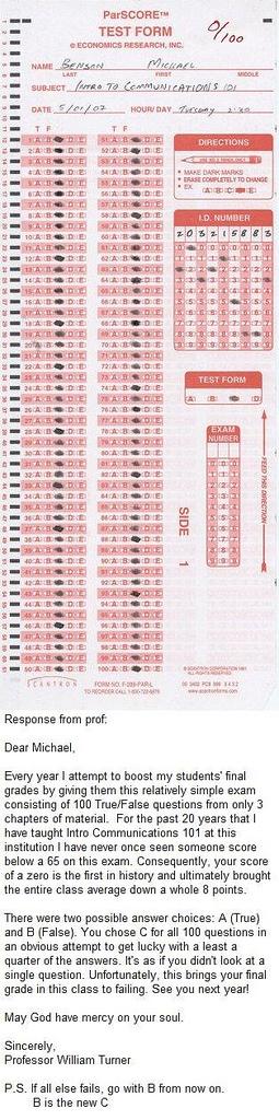 I remember a uni lecturer many moons ago, who proceeded to quizz me rather vigorously why I had written down a wrong answer to one of his questions on an exam, when clearly he had spent many hours and much effort reinforcing the subject in both face time, tutorials and assignments.