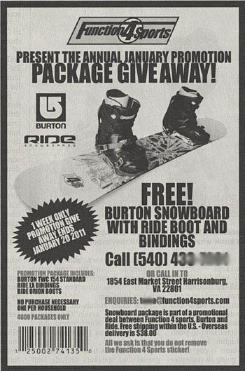 Function 4 Sports. Free Burton snowboard with Ride boot and bindings.