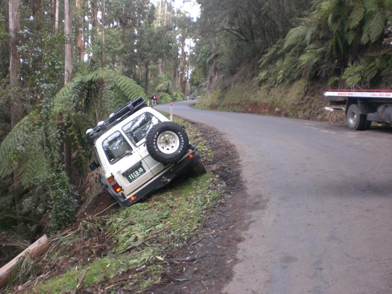 My brother and hes father in-law (and respective families) were driving through Vic country (near sky fields?) when some moron cut a corner and forced them to take evasive action. As you can see from the pics, they were very lucky they didnt roll down the steep hill.