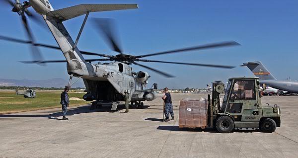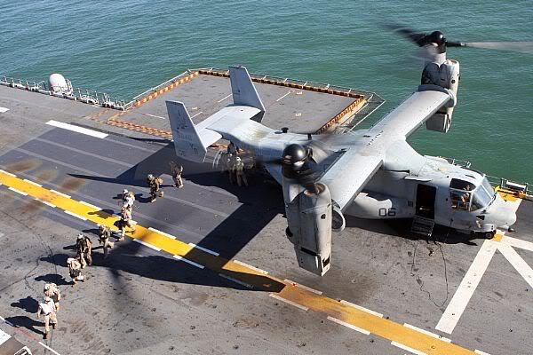 PORT-AU-PRINCE, Haiti (Jan. 19, 2010) Marines from Marine Medium Tilt Rotor Squadron (VMM) 162 (Reinforced), 24th Marine Expeditionary Unit (24th MEU), depart an MV-22 Osprey on the flight deck of the amphibious assault ship USS Nassau (LHA 4). The 24th MEU Marines are embarked aboard vessels assigned to the Nassau Amphibious Ready Group on a six-month deployment.