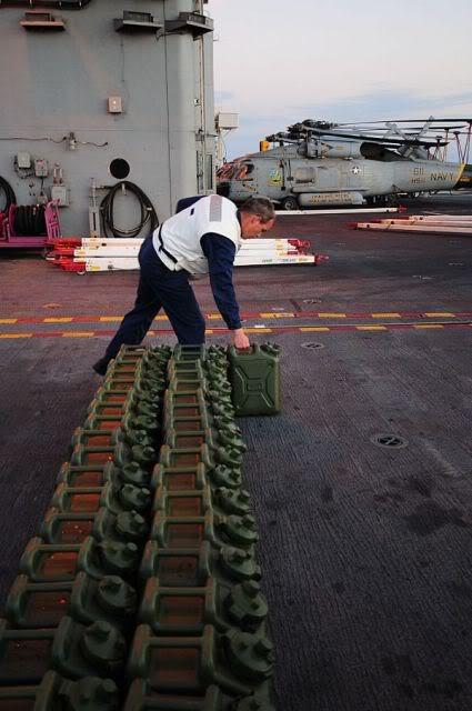 CARRIBEAN SEA (Jan. 23, 2010) Cmdr. Craig Hackstaff stacks jugs of water on the flight deck of the Nimitz-class aircraft carrier USS Carl Vinson (CVN 70). The water will be delivered to earthquake victims.