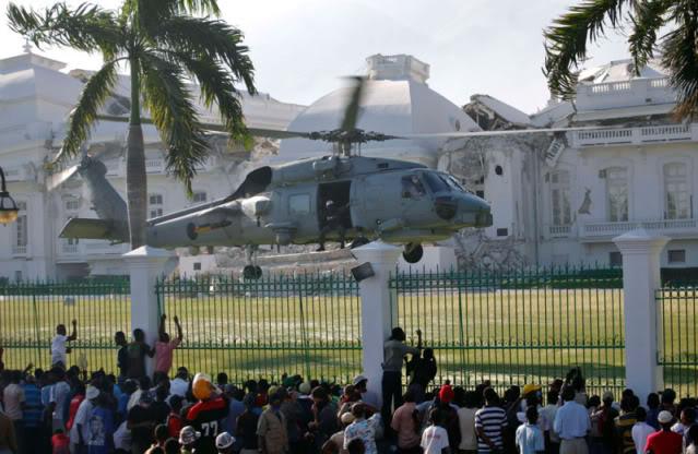Soldiers with Charlie Company 1/ 325th avoid rotor wash as a Navy helicopter lifts off from the lawn of the heavily damaged Presidential Palace in Port-au- Prince, Haiti