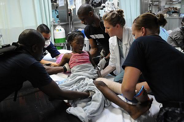 PORT-AU-PRINCE, Haiti (Jan. 21, 2010) Medical professionals move a Haitian girl to a hospital bed aboard the Military Sealift Command hospital ship USNS Comfort (T-AH 20). Comfort is anchored off the coast of Haiti supporting Operation Unified Response after a 7.0 magnitude earthquake caused severe damage near Port-au-Prince on Jan. 12, 2010.