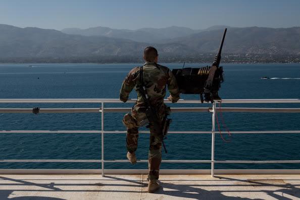 MA3 Hootman keeps watch on the USNS Comfort, a U.S. Naval hospital ship, on January 21, 2010 in Port-au-Prince, Haiti. The Comfort deployed from Baltimore with 550 medical personnel on board to treat victims of Haiti's recent earthquake, and arrived on January 20