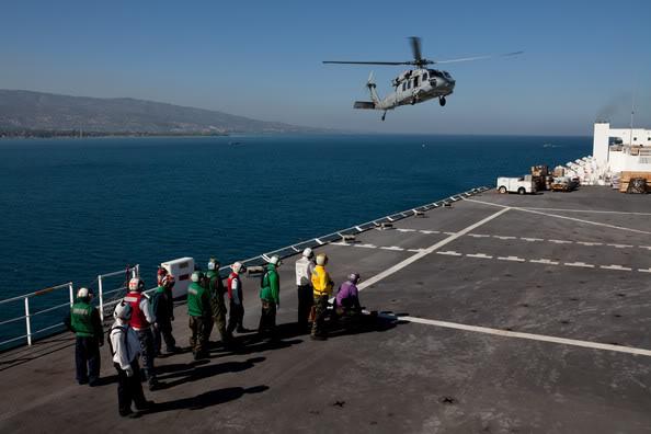 An MH-60S helicopter lands on board the USNS Comfort, a U.S. Naval hospital ship, with Haitian earthquake victims needing medical treatment on January 21, 2010 in Port-au-Prince, Haiti. The Comfort deployed from Baltimore with 550 medical personnel on board to treat victims of Haiti's recent earthquake, and arrived on January 20.