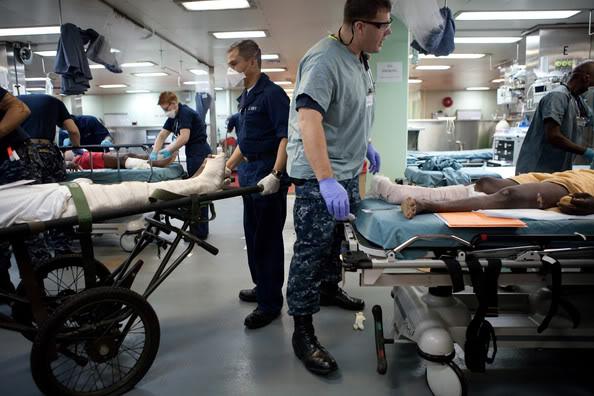 Naval medical staff treat Haitian earthquake victims, both with suspected fractured femurs, in the casualty receiving area of the USNS Comfort, a U.S. Naval hospital ship, on January 21, 2010 in Port-au-Prince, Haiti. The Comfort deployed from Baltimore with 550 medical personnel on board to treat victims of Haiti's recent earthquake, and arrived on January 20.