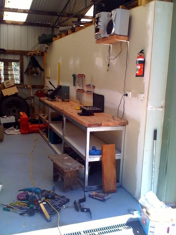 Ok, update. Bolted the vice to the bench and the grinder/sander. I also knocked up a shelf for the stereo...gotta have some tunes in the shed.