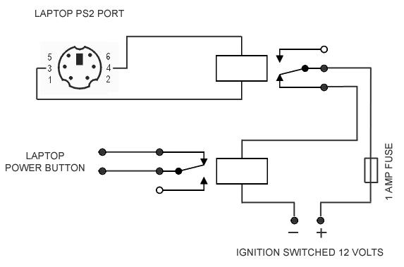 Theres two relays. one wired to the laptops power resume button. The lower one in the above pic. When its energised its closing the contacts of the button on the laptop effectively turning it on. The power to the lower relay is controlled also by the upper relay, which is a normally closed relay. Hence when its energised by the laptops PS2 port it opens and stops the 12 volts getting to the lower relay hence opening the contacts of the laptops power button. This way the power button is not simply "held down" all the time the ignition is on. The main idea though is the laptop goes into hibernation after 5 minutes on battery. But untill it goes into hibernation, the the PS2 port is putting out 5 volts, keeping the power cut to the second relay, hence the laptops button cant get pushed while the laptop is on - if it was a simple case of the laptop is on, you turn the cars ignition off, the laptop goes to battery mode and starts counting down 5 minutes, then you start the car up again within that 5 mins, the ignition switched relay still wont close as the laptop switched relay is still open. If the ignition switched relay closed it would turn the laptop off!.