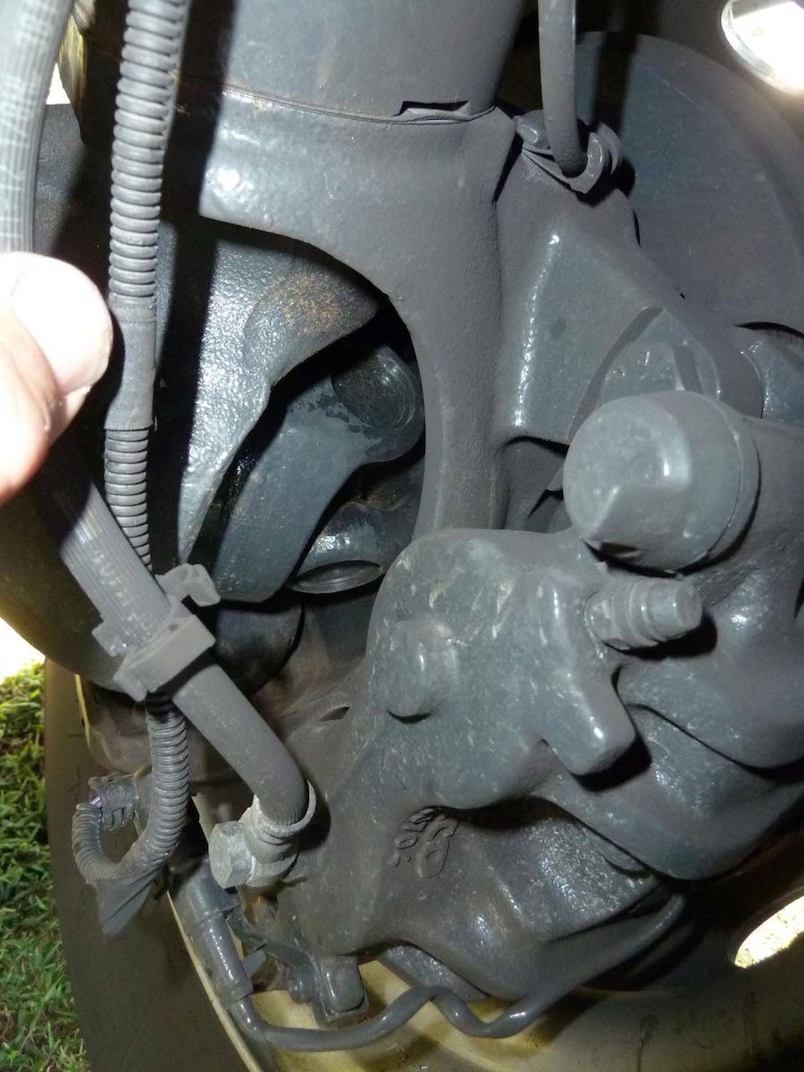 looking into the steering knuckle of full lock you can see the uni, very well protected unlike the open uni on a jeep, wires into the knuckle are ABS sensor, cable into the caliper is low pad warning sensor