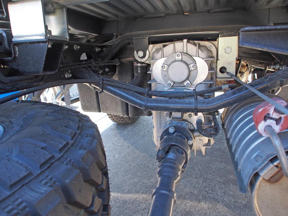 looking up from the front, note transfer case is remote, prop at the top comes from the gearbox, bottom prop is heading for the front diff
