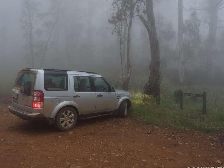 Started off on Davis Plains Tk, but decided not to chance a muddy climb, so long way around to Omeo, then onto Birregun Tk to Dargo (where we were booked into). Of course thick fog (3-5m visibility) on the track, as shown with the D4 at the Dog's Grave,