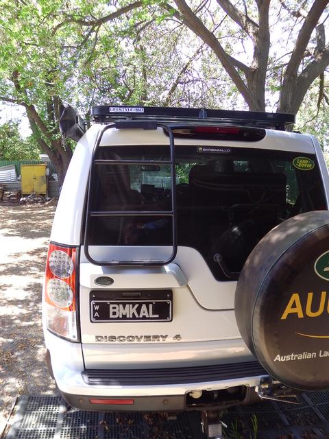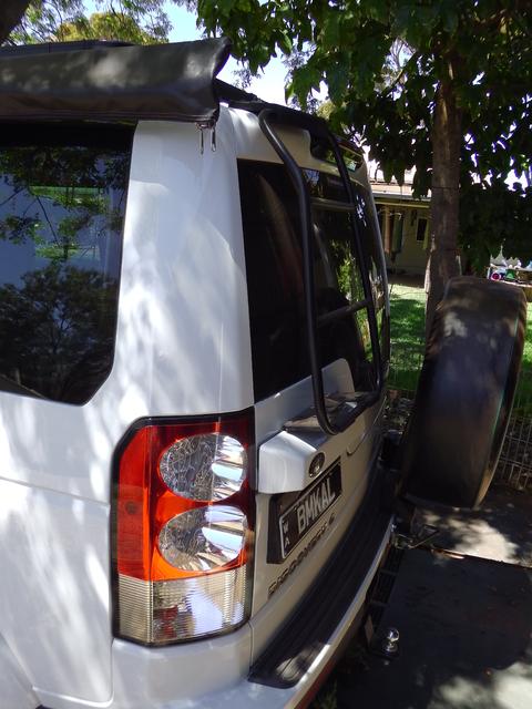 Any chance you could post a picture of the fitted rear access ladder for disco 4 with the tailgate open. Also can you tell me how far the top of the ladder protrudes back towards a roof rack when the tailgate is open. Trying to determine if it will hit my full length rhino rack pioneer.