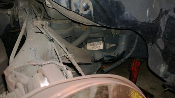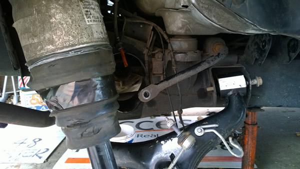 In this pic you can see that all the broken parts have been removed and the new lower control arm has been put into position. Also visible is the air spring/ shock absorber strut. It had a minor ding in the aluminium casing around the air spring, and the dust jacket was torn. The dust jacket was re-attached with the time honoured but effective tie wire!