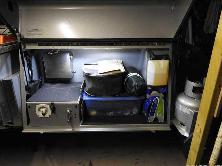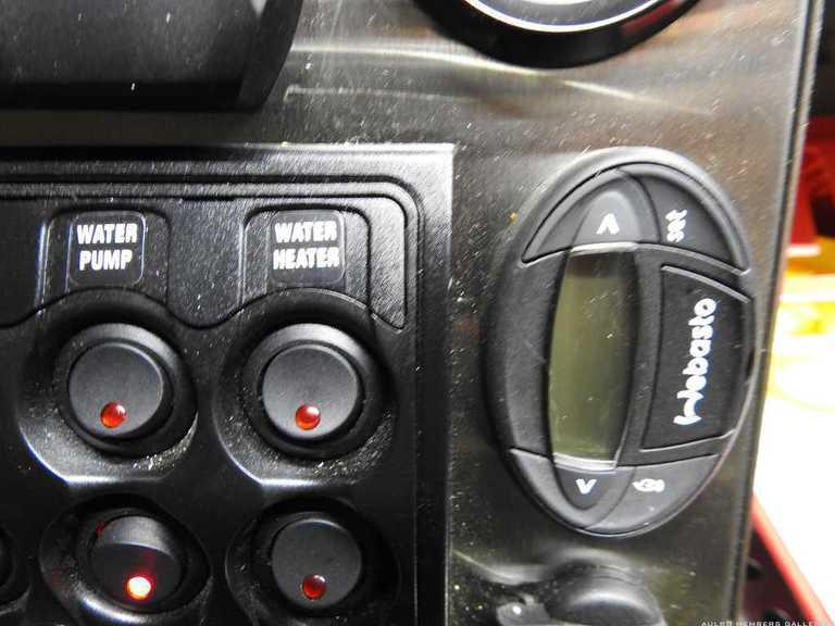 The control panel & master switches, mounted in the front kitchen side area. Water pump doesn't get turned on if your only running the heater, only if you want hot (or cold) water. The Webasto is started/stopped from the control unit. You can start it, then set a run time (up to 60min), then it shuts down after the time has elapsed. It can also be set to startup at one of 3x preselected times ... ie:set it to turn on at 7am for 30min so the tent is all nice and toasty when you get out of bed ... luxury! There's also a modification that can be done at the control panel to wire in a switch which effectively over-rides the timer circuit to make the FBH run continuously.