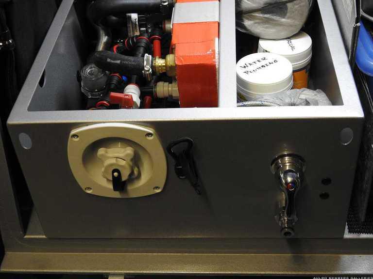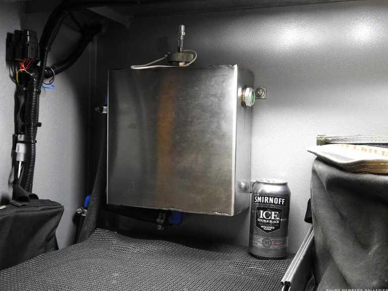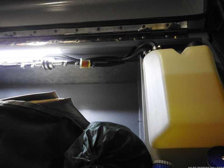The business side of the kamper ... Diesel tank RHS, Glycol header tank LHS and box below glycol tank houses the Webasto, water pump, heat exchanger and changeover valves (water inlet pressure reducing valve & flick mixer/garden hose click-on connection of showers is on the front of the box)