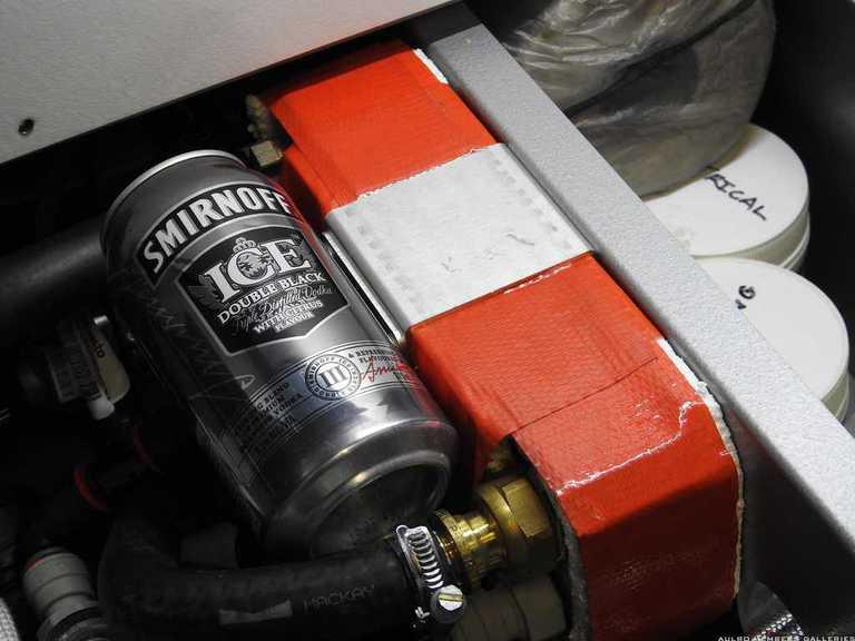 This is the hot water heat exchanger ... Not much bigger than a can. Spec' says it has a 0.15L water holding capacity. It's wrapped in styrene foam and the red gaffa is used to keep it all together ... not very big at all.