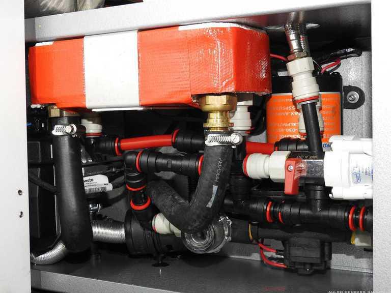 Here's a closeup of the "box". Heated glycol from the Webasto enters the heat exchanger via the LHS rubber hose, then exits via the RHS rubber hose, which then continues on to the heater in the tent (approx' 2.5m run), then returns to the header tank, then back to the Webasto inlet. It's circulated by a small pump built into the Webasto. The red pipework is the hot water delivery which drops through the floor and travels across the kamper to the kitchen, and also delivers hot water to the shower mixer tap. Can be driven by the pump in the box with water supply from the rear water tank ... Rear tank can be isolated and mains water can be used via the pressure limiter inlet (white device on the RHS of the photo) to supply the hot water ... OR a suction line can be attached to the pressure limiter inlet so the 12v pump can be used to draw water from an external source (bucket, creek, river, etc) for endless hot showers! The silver hose at the bottom left is the Webasto air intake line with a muffler fitted (black plastic item).