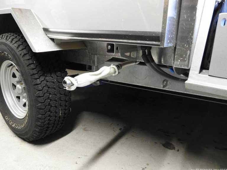 Then there's an exhaust for the Webasto. Leaves through the floor of the "box" and is routed out the side. The extension (covered in an insulating sleeve) is shown fitted IF you need to clear the canvas side skirt. The exhaust is (obviously) very hot, BUT there's very little if any smoke or particulate matter emitted ... a tad on startup, and virtually no bad smells of burning diesel ... the unit burns such a minute amount of diesel that there's next to nothing out the exhaust.