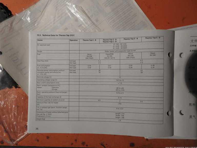 ... and finally, the spec' sheet from the owners manual. My unit is the Thermo Top E - D (4.2kw output). The fuel consumption figures shown must be the max/extreme useage figures as mine doesn't burn anywhere near what's stated. All depends on the duty cycle.