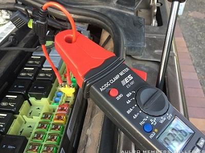 I've been leaving the vehicle locked the bonnet open and the battery disconnected. I bridge the negative terminal and clamp with the multimeter to take a measurement.