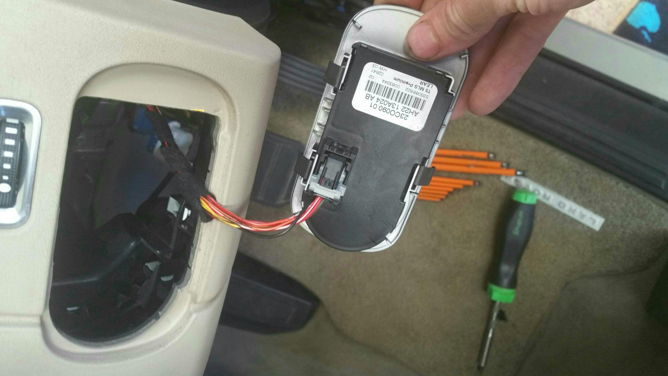 First reach up from the back and squeeze the tabs on the headlight control panel and push out. Then you can run some velcro down the inside for the Tow Pro. This is looking directly down through the panel: