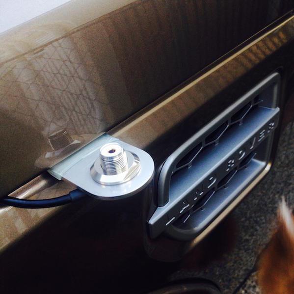 This is usually a shopping trolley, and I don't have (or want) a bullbar, so I made up an antenna mount for the roof. Coax runs underneath the roofrail, down the a-pillar and into the engine bay. Then through the firewall into the remote unit. Makes for awesome reception up that high!