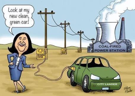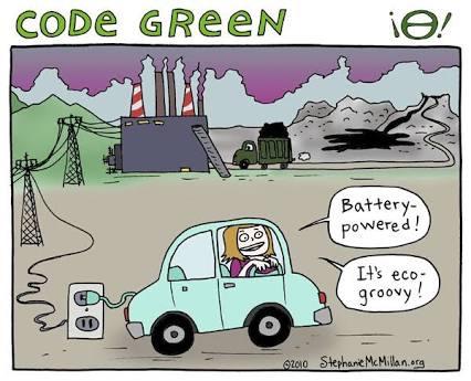 There's plenty of cartoons demonstrating the major issue about the environmentally friendly car. The other problem is the limited lifespan of the batteries & the emissions caused by creating the car. Nothing is truly renewable. If we weren't so dependent of upgrading cars so often in this throwaway society we could develop a nuclear powered car.