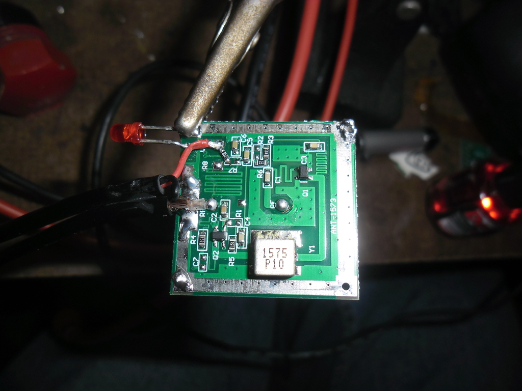 R8 is a 150 Ohm resistor that supplies 5V to the Antenna, and R7 is a 2K resistor that supplies power to the LED. The theory being if the antenna is shorted the led is out. I removed R8 and bodged R7 across to the 5V input to make the LED come on. I could have just removed both.