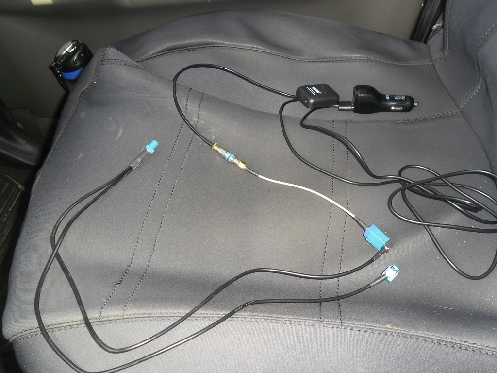 The concept is to split the NAV GPS and feed it to the transmitter. I did this with a Fakra splitter, and Fakra to SMA adapter cable :
