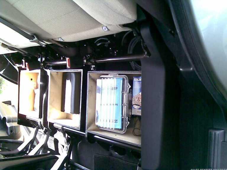 There are 3 positions under the rear seats that will fit a custom made box, and painted gloss black to match the surrounding metalwork makes them difficult to see by an opportunist