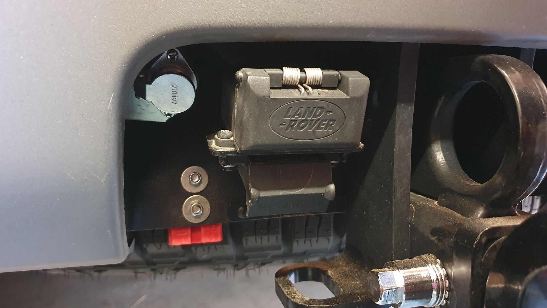 You can see the red Anderson plug poking down. It will be capped when not in use. Under the Land Rover trailer plug is the Anderson plug which connects to the camper trailer and the round plug is for the "Wazza" cable to connect the twin cameras on the rear of the Camper. The chrome bolt is the Hayman Reese "rattle stopper" hitch pin.